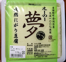 今回は吉田町可愛(えの)地区の大豆を100%使用した安心の豆腐、「えーのー夢豆腐」(170円)を購入しました。「可愛」を「えの」と読むのは難しいですね。