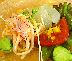フォ~~~!!!来ました米粉の生パスタ。今回は「なすとおくらの和風シーフードパスタ」とのこと。