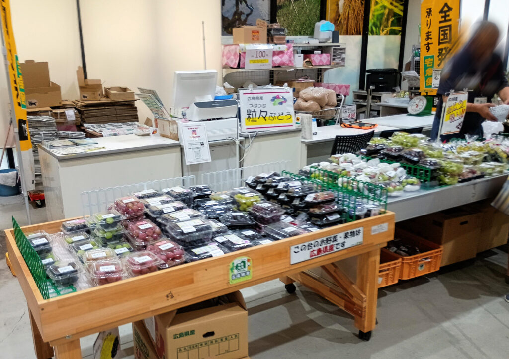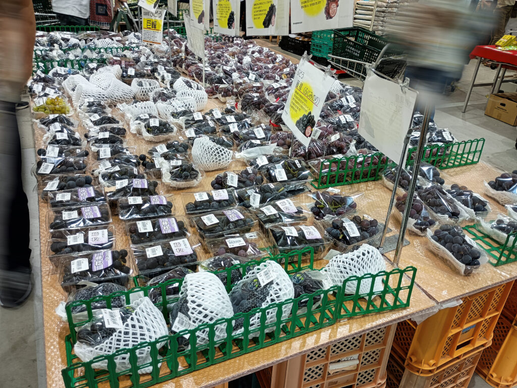 「とれたて元気市 広島店」でコスパ抜群の新鮮な野菜や果物!ピオーネやマスカットなどのブドウ山盛り!(広島市安佐南区大町)