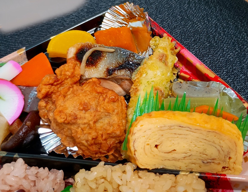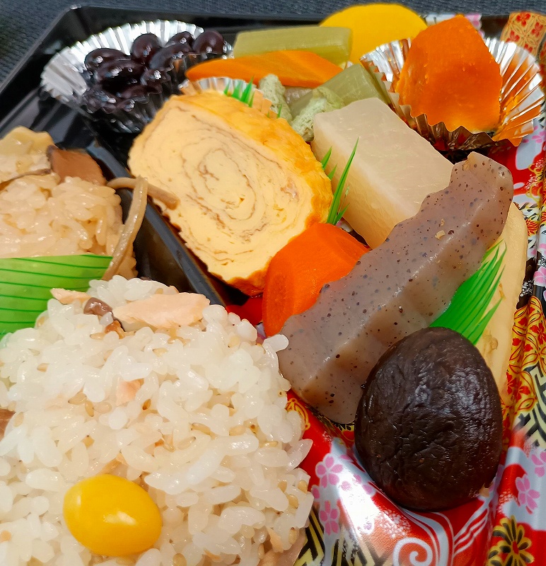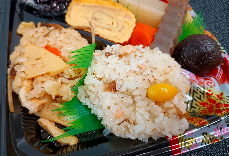 おこわは2種類! 手前は、彩り豊かな鮭きのこおこわ。 奥は、たけのこ、人参、油揚げが入った、王道の五目おこわだ。