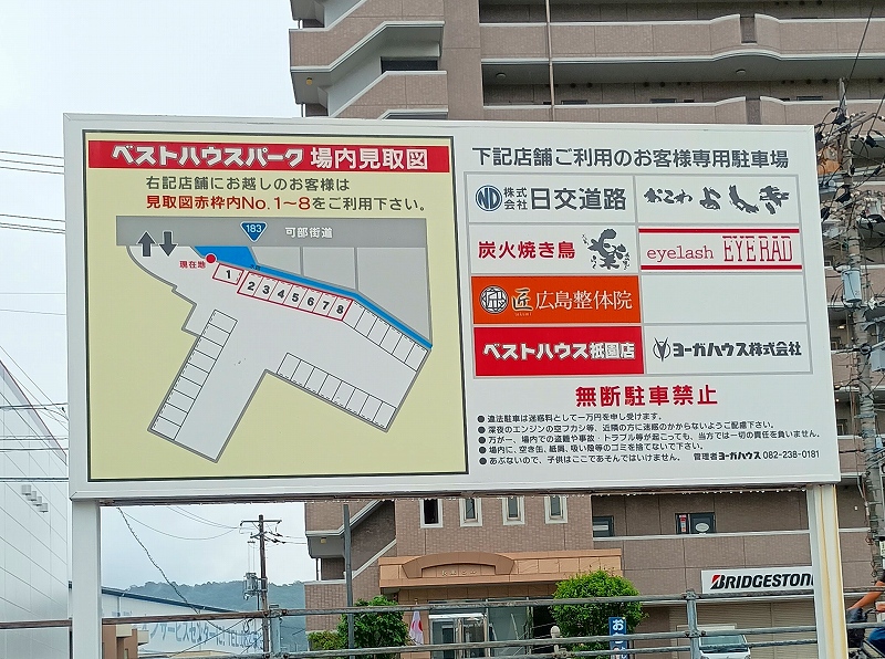 駐車場は、南側に少し離れた「ベストハウスパーク」ってところだ。看板をよ~~く見ろ!No.1からNo.8が『おこわのよしき』の利用者用の駐車場だ。 間違っても他の場所に停めるんじゃねぇぞ!ルールを守ってこそのパンクだZ!