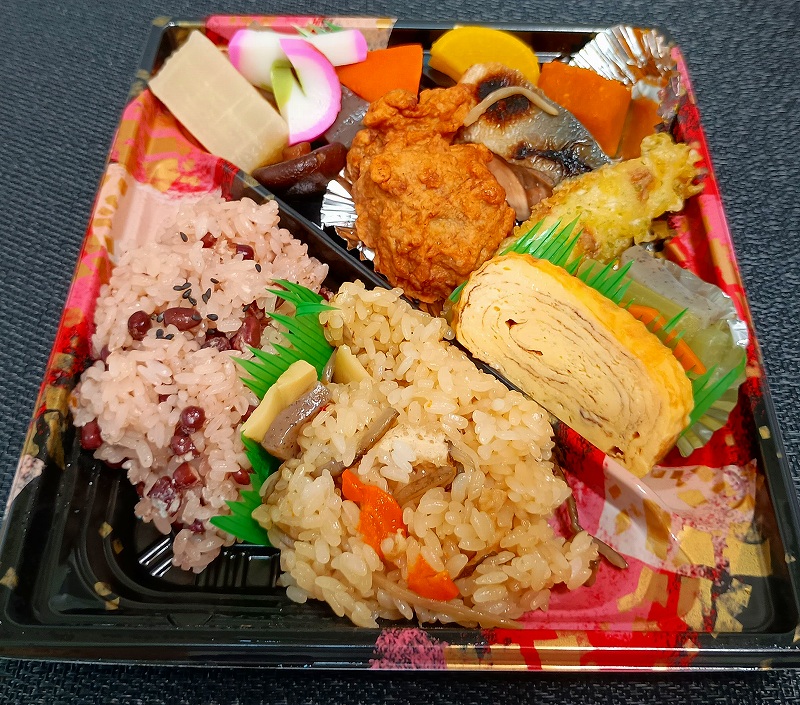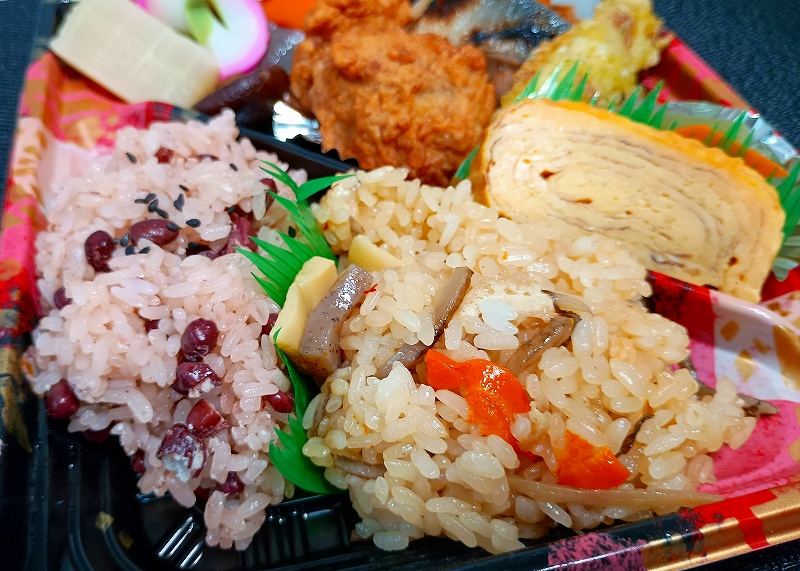こっちはさらに豪華絢爛、ボリューム爆発!! おこわは、赤飯(ごま塩パラリ)と五目おこわの最強タッグ! 赤飯の小豆の風味と、もち米の甘みが絶妙なハーモニーを奏でてやがる!